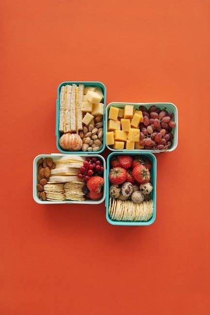 Analyzing GOLO 7-day meal plan PDF examples reveals a focus on snacks that stabilize blood sugar and minimize insulin spikes․ A handful of almonds or walnuts provides healthy fats and protein, promoting satiety․ Celery sticks with a tablespoon of natural peanut butter offer a satisfying crunch and sustained energy․